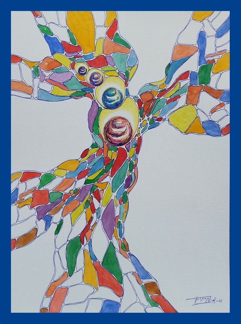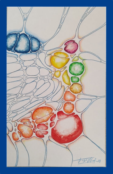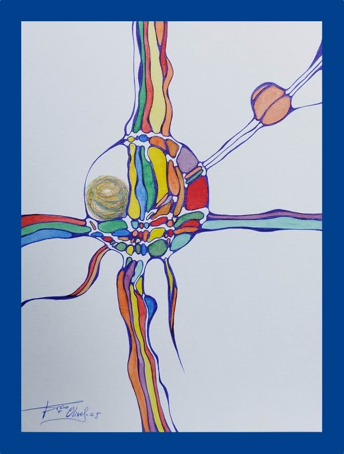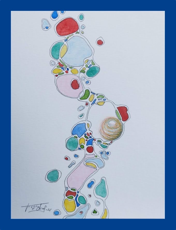 La técnica utilizada, como es habitual en mi obra, es la acuarela, sumado al remarcado de la mancha generada, con grafito y bolígrafo de colores, sobre papel.